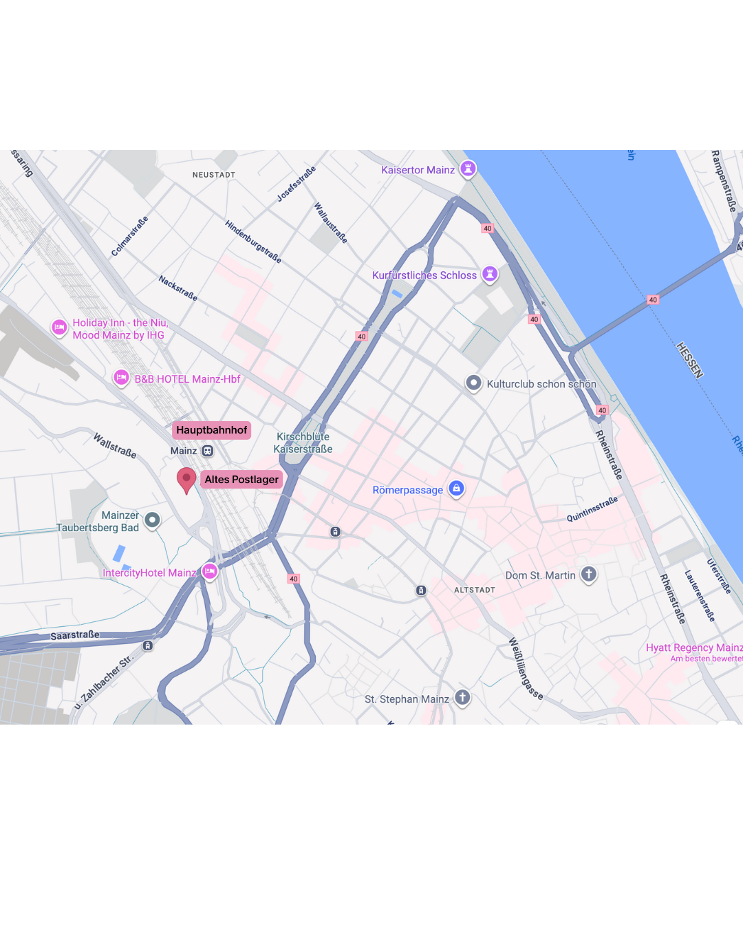 Das Alte Postlager liegt in unmittelbarer Nähe zum Mainzer Hauptbahnhof. Nutze den Ausgang „Mainz Hauptbahnhof West“ (Richtung Mombacher Straße). Dieser Ausgang ist über Treppen, Rolltreppen und Aufzüge erreichbar. Folge der Wallstraße. Du erreichst das Alte Postlager auf der rechten Seite. Gehe einmal um das Gebäude herum und du erreichst den Haupteingang.